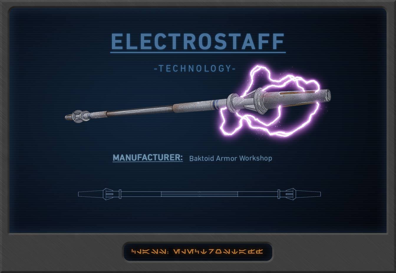 Weapons: DLT-19X targeting rifle; electrostaff; modified blaster pistol (see references)